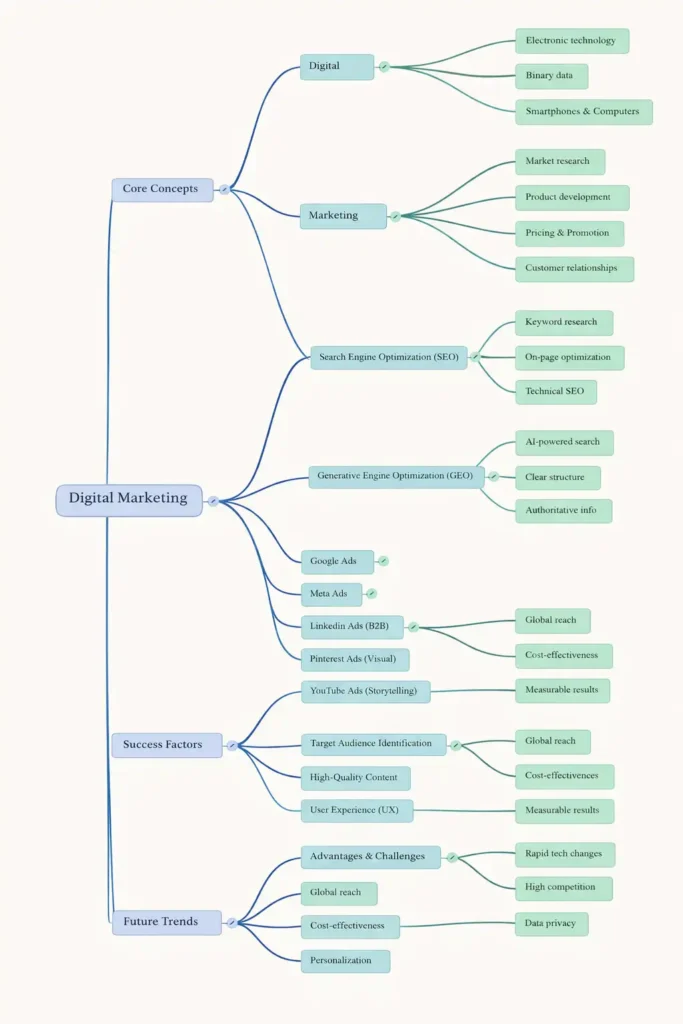Understanding the concepts of digital and marketing individually helps clarify how digital marketing functions as a modern promotional system. Organic marketing methods such as SEO, GEO, content marketing, and social media engagement help businesses build long-term credibility, while paid marketing methods such as Google Ads, Meta Ads, LinkedIn Ads, Pinterest Ads, and YouTube Ads provide immediate visibility and faster results.